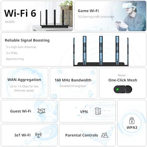 Reyee AX3000 Wi-Fi 6 Router, Dual Band Internet, 802.11ax Wireless, Coverage up to 3,000 Sq. Ft., Gigabit Wan Aggregation, WPA3, Smart VPN for Large Home (RG-E4)