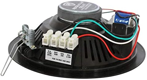 (4) Rockville CCL6T BLACK 70V 6″ Commercial ceiling speakers. Perfect for PA announcements or background music or any other applications where you want many speakers installed. Transformer with terminals for 10 watts, 5 watts, or 2.5 watts. Perfect for restaurants, offices, schools churches, buildings, and other commercial applications. Double paper cone. 0.75” voice coil. 3.5 oz ferrite magnet. 6” woofer. Fireproof screw terminal block. High quality spring loaded push terminals. Paintable flush mount grills. Frequency response: 80Hz – 15kHz. Sensitivity: 88dB @ 1W/ 1M. Impedance: 1K, 2K, 4K ohms. Mounting depth: 2.36”. cut-out diameter: 6.5”. color: Black (paintable) .