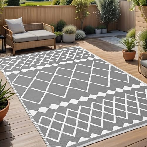 RURALITY Outdoor Rugs 9×12 for Patios Clearance,Large Waterproof Rug for Deck,Backyard,Balcony,Plastic Straw Mats for Camping,Reversible,Grey and White