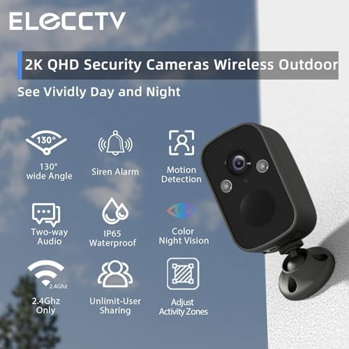 [Crystal Clear 2K Image & Color Night Vision] ELECCTV outdoor camera wireless battery powered features a 110° wide-angle lens that provides crystal-clear 2K QHD 3MP resolution (2304×1296 pixel), delivering detailed and vivid footage. our Full Color Night Vision mode keeps your property secure, even in low-light conditions.