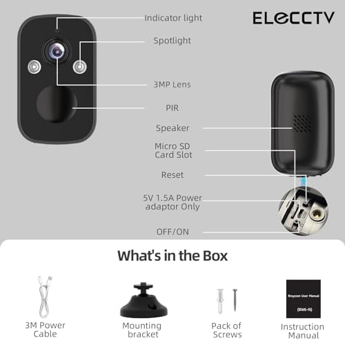 Camera resolution 2048*1536P Waterproof IP65 Waterproof Color Night Vision Freely choose color night vision(2k) or black&white night vision(2K) Cloud storage Freely choose Free 3-Days Cloud playback forever ELECCTV APP O-KAM PRO Local storage Micro SD,Up to 256GB(sd card is not included) Reduce false positives Human-only Detection Field of view 130° Wide Angle Audio Speaker output and 2-way audio recording Wifi connectivity 2.4 GHz Working environment Working temperature: -4 ~ 113F Share live Up to four people can watch the live broadcast at the same time