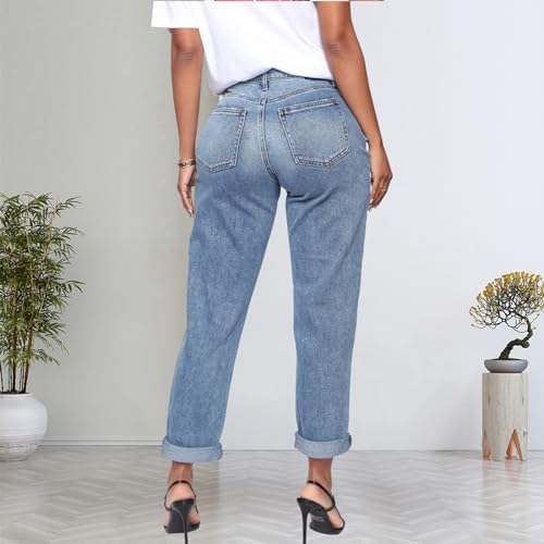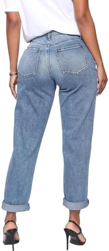 SheKiss Boyfriend Stretchy Jeans for Women – Distressed Frayed High Waisted Trendy Denim Blue Jeans