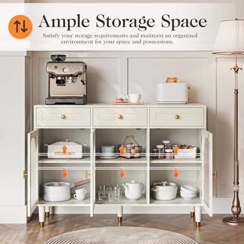 Sideboard Buffet Cabinet with Storage, White Kitchen Storage Cabinet with Adjustable Shelves & 3 Doors, Wood Coffee Bar Table with Drawers for Living Room, Dining Room