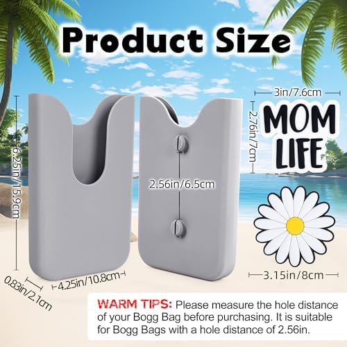 1. Please measure the hole distance and round hole diameter of your Bogg bag before purchasing this phone holder. It is only suitable for Bogg bags and other beach bags with a hole distance of 2.56in/6.5cm and a round hole diameter of 0.5in.