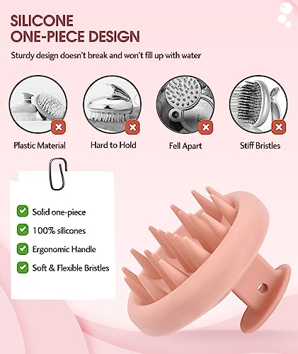 【ONE-PIECE DESIGN HAIR SCALP MASSAGER】 Our scalp massager adopt the upgraded one-piece design, which is more solid and durable. Compared to other scalp brushes, it will never fall apart or break. Food grade silicone material, waterproof and moisture-proof. There is no need to worry about mold and water accumulation