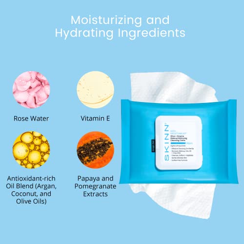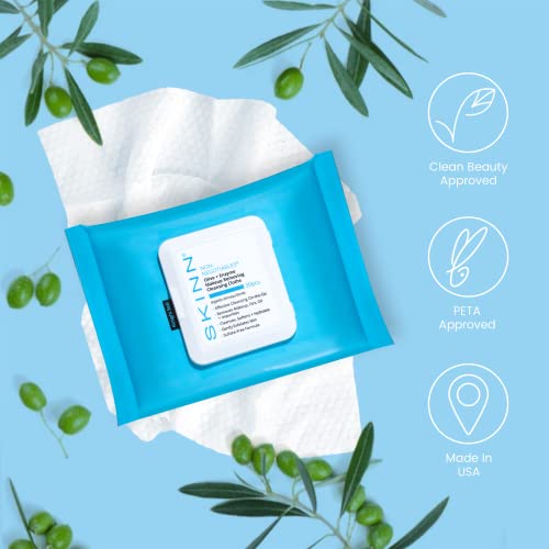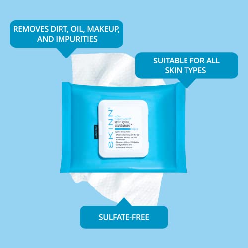 SKINN Facial Cleansing Makeup Remover Wipes – Hydrating Makeup Removing Cloths for Waterproof Mascara, Makeup, Oil, & Dirt – Disposable Face Towelettes that Gently Exfoliates, Cleanses, & Softens Skin