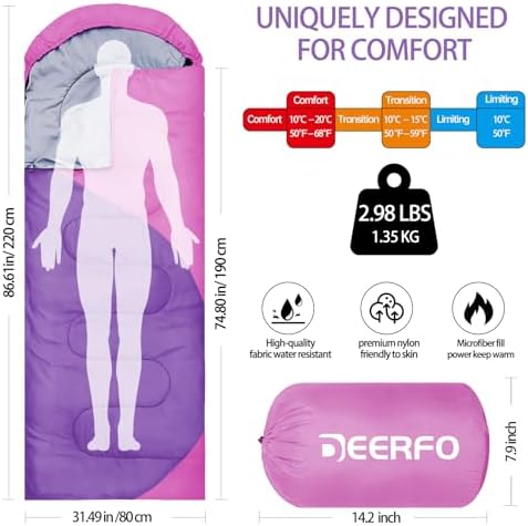 PREMIUM MATERIAL – Camping sleeping bag is made of premium 210T ripstop microfiber fabric, comfortable and breathable, lined with 190T polyester pongee. The waterproof outer protective shell is made of unique hexagonal design and high quality Material with double S-stitching and polyester filling for optimal warmth and insulation to protect you from the elements. The bright colors are loved by boys and girls, great for kids and adults alike!