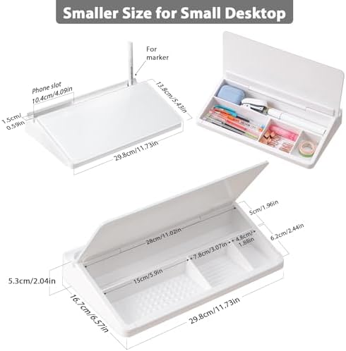 Perfect Size for Small Desks: 11.7″x5.4″ smaller surface is perfect for smaller desktop which has not so much space. Dimensions of the caddy 11.7*6.6*2.1 inches. What’s in the package: 1x eraser, 1 x marker, 1 x Glass whiteboard with 4 storage compartments in thick ABS.