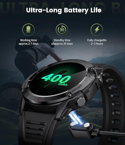 【Multifunctional Smart watch& 400 mAh Battery】Smartwatches have other auxiliary functions, AI voice assistant,compass,weather forecast,calculator,alarm clock,stopwatch,timer,business card,sedentary reminder,remote photography, music control,massive dial and drinking reminder.The brightness can be adjusted,so you can see the contents of the watch under strong outdoor light.The outdoor smart watch has a battery capacity of 400mah,with a standby time of 30 days and a normal working time of 5-7 days.
