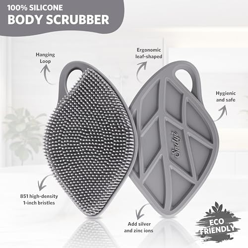 Sndyi Silicone Body Scrubber, Gentle Exfoliating Body Scrubber for Sensitive Skin, Leaf Shaped Shower Scrubber for Body with Lathering Bristles, Silicone Loofah Body Brush for Showering, Gray