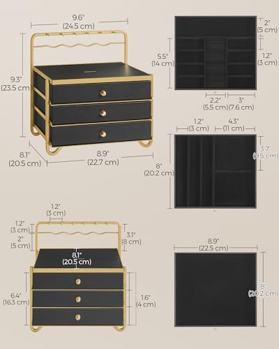 SONGMICS 3-Tier Jewelry Box, Drawer Jewelry Organizer, with Open Storage, Hanging Rack, for Vanity Table, Metal Frame, 8.1 x 8.9 x 9.3 Inches, Gift Idea, Ink Black UJBC168B01