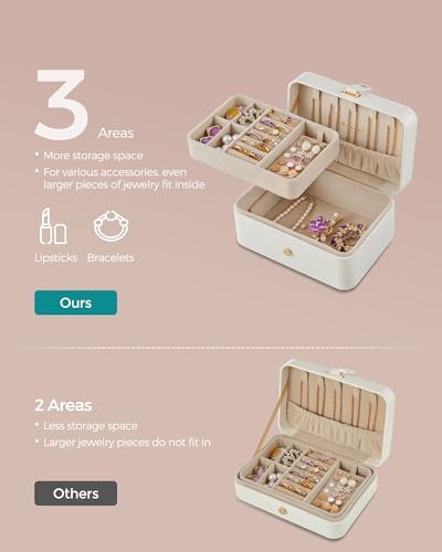 SONGMICS Jewelry Box, Travel Jewelry Case, 2-Layer Jewelry Holder Organizer, 4.6 x 6.3 x 3 Inches, Portable, Versatile Earring Storage, for Larger Accessories, Gift Idea, Cloud White UJBC166W01