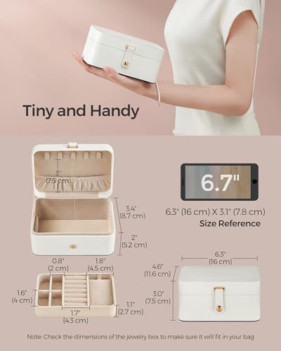 [Compact and Portable] Our 4.6 x 6.3 x 3 inches jewelry case easily fits in your bag or suitcase, allowing you to bring your favorite pieces on the go. Perfect for travel or business trips. Pack and carry with ease!