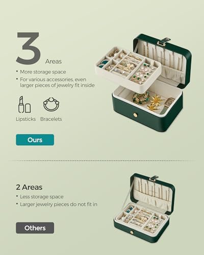 SONGMICS Jewelry Box, Travel Jewelry Case, 2-Layer Jewelry Holder Organizer, 4.6 x 6.3 x 3 Inches, Portable, Versatile Earring Storage, for Larger Accessories, Gift Idea, Forest Green UJBC166C01