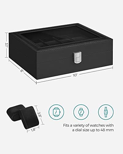 SONGMICS Watch Box, 10-Slot Watch Case with Large Glass Lid, Removable Watch Pillows, Watch Box Organizer, Father’s Day Gifts, Black Synthetic Leather, Black Lining UJWB010B02