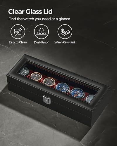 SONGMICS Watch Box, 6-Slot Watch Case with Large Glass Lid, Removable Watch Pillows, Watch Box Organizer, Father’s Day Gifts, Black Synthetic Leather, Wine Red Lining UJWB006R01