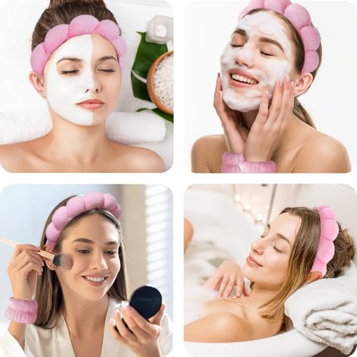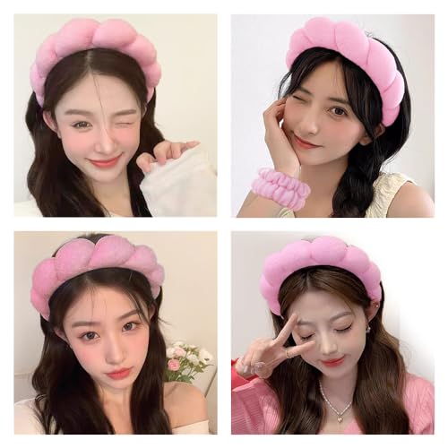 Spa Headbands for Washing Face Wristband Set Sponge Makeup Skincare Headband Wrist Towels Bubble Soft Terry Towel Cloth Hairband for Women Puffy Headwear Non Slip Thick Hair Headwear (Pink)