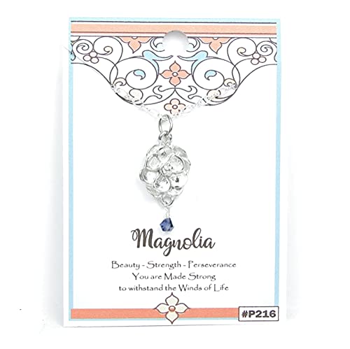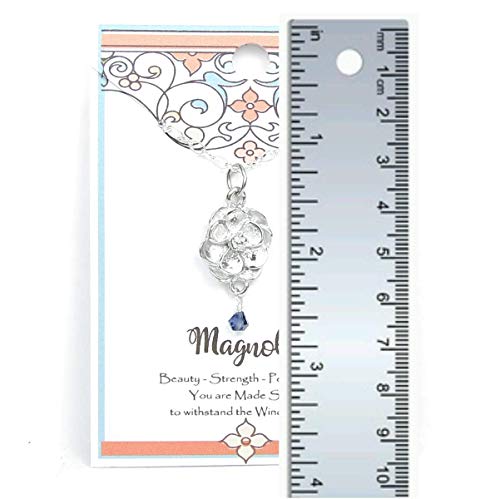 Elevate your style with our stunning handcrafted pewter Magnolia Necklace. This charming necklace features a Magnolia Flower handcrafted in pewter with a small denim blue crystal bead hanging under the flowers for a touch of sparkle and color. Symbolizing Beauty, Strength and Perseverance this lovely Magnolia necklace is inspirational and beautiful. Gift Packaged with an inspirational card quotes Steel Magnolias : “Beauty – Strength – Perseverance – You are made Strong to withstand the Winds of Life”, artist bio, and a chic organza gift bag. Great gift for women, mom, grandma, sister, aunt, niece, girlfriend, wife, best friend, daughter, teacher or yourself. Magnolia Flower pendant with bead is approximately 1.2″ tall and .65″ wide. Magnolia Flowers are cast in American Pewter. Pewter is Lead and Cadmium Free and Manufactured in USA. Polished stainless steel cable link necklace length is available in your choice of 18″, 20″, 22″ and 24″ lengths with a lobster claw clasp.