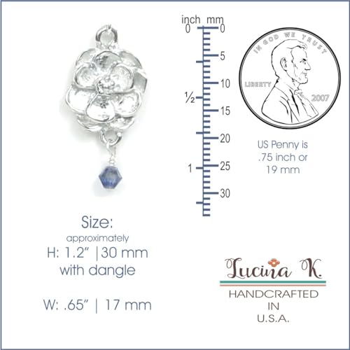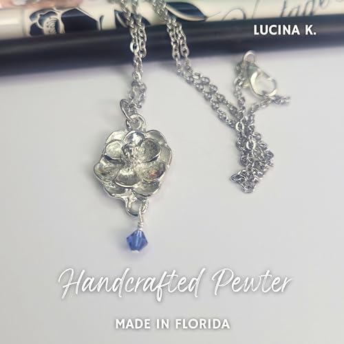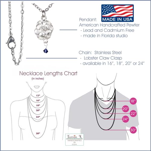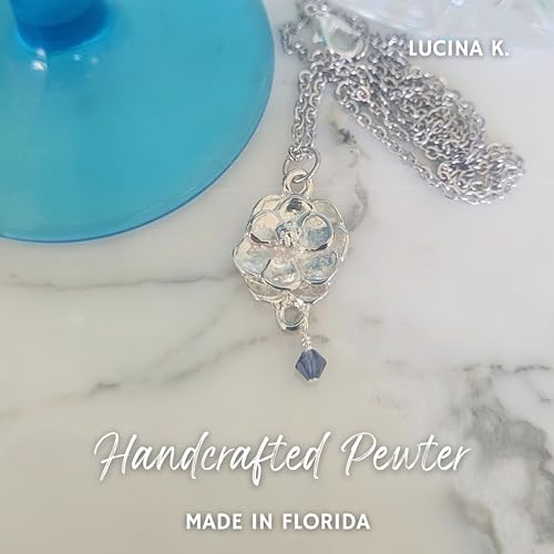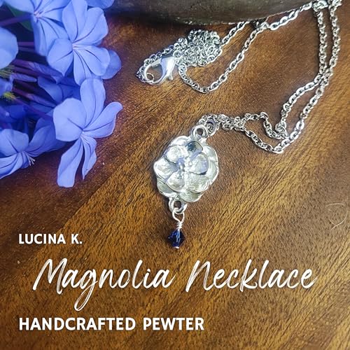 [ Product Details ]:Necklace chain is polished stainless steel for exceptional durability. Magnolia Flower pendant is handcrafted in pewter with a small denim blue crystal bead hanging under the flower for a touch of sparkle and color. Pewter is Lead and Cadmium Free and Manufactured in USA.