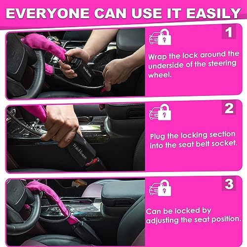 UNIVERSAL FIT – Pink car anti-theft device is designed to fit most car models, including SUVs, vans, trucks, and more. The adjustable design allows easy linking between the steering wheel and seat belt lock plug by simply adjusting the position of the seat.