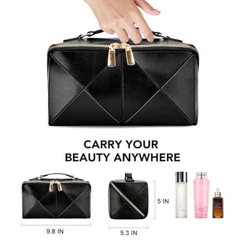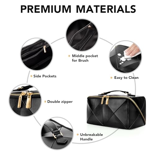 stona Travel Makeup Bag for Women, Large Capacity PU Leather Waterproof Checkered Cosmetic Bags, Portable Pouch Open Flat Toiletry Bag, Make up Organizer with Divider and Handle