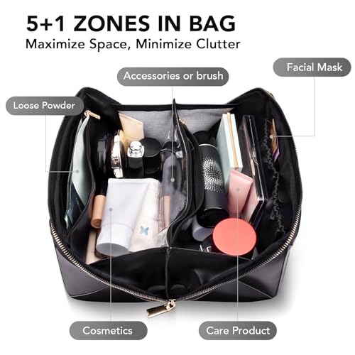 【LARGE CAPACITY COSMETIC BAG】The toiletry make up bag has 2 main compartments, 4 small pockets, extra front pocket for cards and valuables. 2 large compartments easily hold travel toiletries or large skincare products. 2 retractable pockets and 2 zipper pockets hold concealer, lipstick, brushes or other small items.