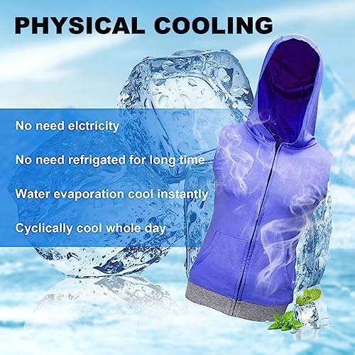 Appearance Design: Breathable mesh cooling vest with hood and zipper closure. Two slanted pockets. Available in gray and purple, comfortable and fashionable.