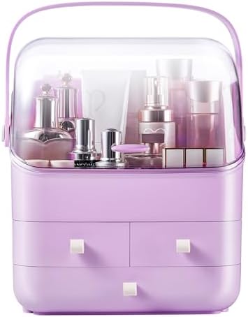 SUNFICON Large Makeup Organizer Holder Cosmetic Storage Case Beauty Essential Box Dust Free Cover Portable Handle Fully Open Waterproof Lid Drawers Bathroom Countertop Bedroom Dresser Purple