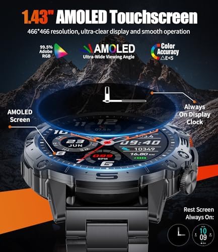 🌈【Premium AMOLED Screen】The military smart watches for men features a large 1.43inch AMOLED screen, which is more energy-efficient and colourful than traditional LCD.With ultra-high resolution 466*466, it can display vivid and high-definition colours even in outdoor or sunlight, bringing you unprecedented visual clarity. You can also freely adjust the right brightness to take care of your eyes.In addition, the AMOLED has”Always-on-Display”function, so you no longer need to lift your wrist or touch the screen to check the time, and the display never rests.