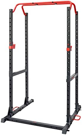 Sunny Health & Fitness Power and Squat Rack with High Weight Capacity, Olympic Weight Plate Storage and 360° Swivel Landmine and Power Band Attachment