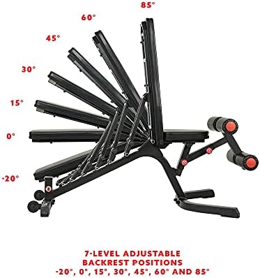 BACKREST SETTINGS: This weight bench has 7 adjustable positions(-20°, 0°, 15°, 30°, 45°, 60°, 85°) for a variety of workout options.