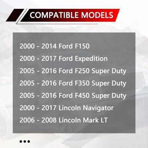 2000-2014 Ford F1502000-2017 Ford Expedition2005-2016 Ford F250 Super Duty2005-2016 Ford F350 Super Duty2005-2016 Ford F450 Super Duty2000-2017 Lincoln Navigator2006-2008 Lincoln Mark LT