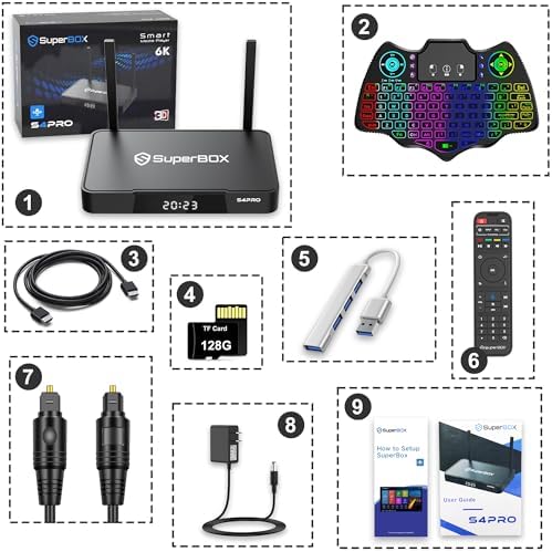 Super-S4 P-R-O, 2023-2024 Model, Android 9.0 Box, Fully Including S-4 P R O Voice Remote, Backlit Keyboard, HDMI Cable, Audio Cable, 128GB TF Disk, USB Hub