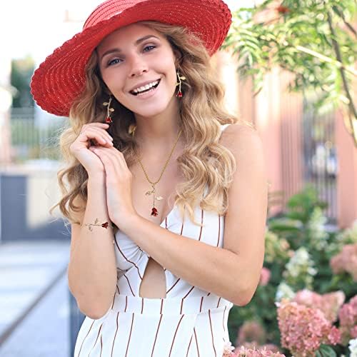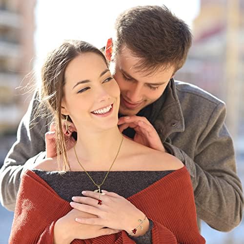 Sureio 18K Gold Plated Jewelry Set Rose Necklace Bracelet Earrings Personalized Red Rose Flower Necklaces Aesthetic Chain Bracelet Beach Anklets Dangle Hook Earrings for Christmas Gift Girls Women