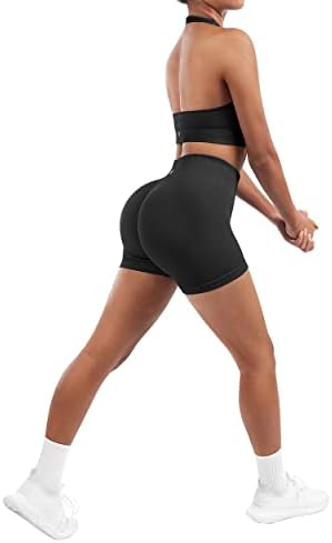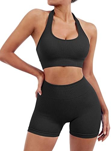 SUUKSESS Women Seamless Ribbed Workout Set Backless Sports Bra Booty Biker Short