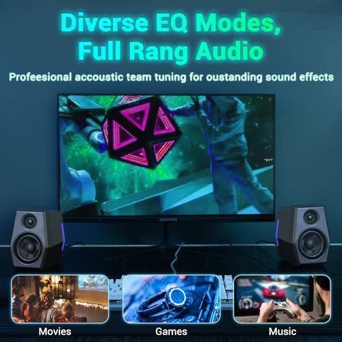 SW209 36W Computer Gaming PC Speakers – Built-in 24bit DAC Dynamic 3D Surround Sound – Bluetooth 5.0 USB 3.5mm Aux Inputs – Three EQ Sound Mode – RGB Backlit Multimedia Speakers (Pair, Black)