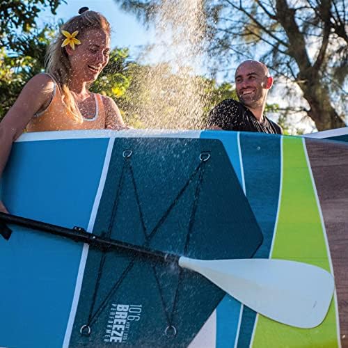 The BREEZE PERFORMER 10’6 Premium inflatable package starts with an 10’6 x 33″ board that is made utilizing premium Drop Stitch Construction with integrated durable, Dual Layer stringer technology. This gives the board exceptional rigidity and durability while keeping it ultra-light (23#). The 10’6 x 33″ hull is highly efficient offering great tracking and glide with exceptional stability for paddlers up to 235#. Great for Touring or Flat Water Cruising with friends and family. The package includes the board, a premium adjustable paddle, Tool-Free Removeable fin, Leash, High-Pressure pump with gauge, repair kit (Material patch included but NO Glue/Adhesive) and a convenient backpack style carry/storage bag. Features include Bungee Deck Rigging for gear storage, 3 carry handles (Center, Nose, and Tail), and a premium paddle that’s easily adjusted to accomodate a wide range of paddler of different heights and ages.