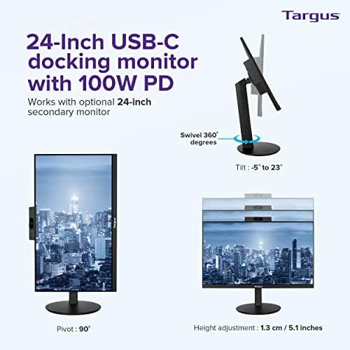 Targus 24-inch USB-C Docking Computer Monitor w/ 100W PD, Adjustable Height Mac PC Monitor 360 Degree Rotating 24 inch Monitor Gaming Monitor w/Dock, Dual Monitor Compatible w/DM4240SUSZ (DM4240PUSZ)