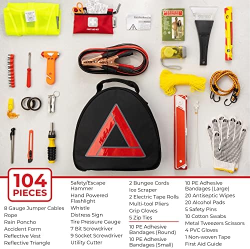 Thrive Roadside Emergency Car Kit (104 Pieces) – Car Safety Accessories and Tool Kit with Jumper Cables and Mini First Aid Kit – Car Emergency Kit for Women and Men (Triangle Bag)
