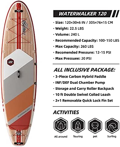 The THURSO SURF Waterwalker 120 is our most nimble and agile all-around inflatable paddle board. It accelerates quickly and turns effortlessly. With its hybrid shape of a traditional all-around board and a touring board, the Waterwalker 120 is a great board for recreational paddling, touring, and surfing. The Waterwalker is the ideal first paddle board for beginners, and is fun for intermediate/advanced paddlers. Size 10′ x 30” x 6”. Weighs 22.5 lbs. Recommended/Max capacity 100-150/260 lbs.