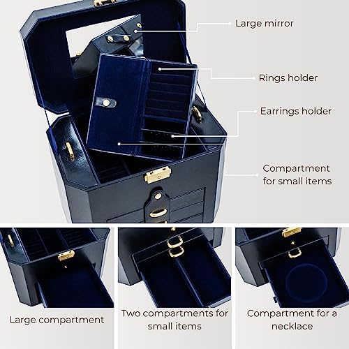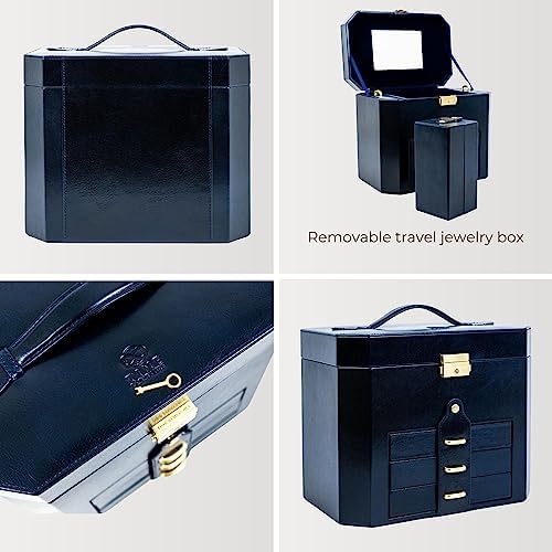 Time Resistance Leather Jewelry Box | Full Grain Leather Jewellery Organizer | Navy Blue Accessories Storage Key Lock Box for Women (Blue)