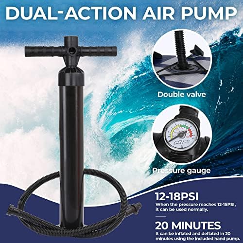 【Two-Way Hand Pump】Unique ergonomic handle design makes it easier for you to inflate the paddle in less time. Sensitive press gauge help read the inflation pressure (12-15psi) at any time. Inflating and deflating function is not restricted by the venue, free to set sail!