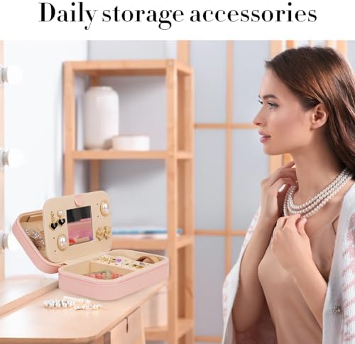 ✅【MULTI-FUNCTION JEWELRY BOX】Compact size allows this jewelry box to be easily stored in your handbag, but it has a large capacity and can store messy jewelry. The box contains 3 parts, the top part can hold 5 necklaces and has an elastic storage bag to keep the necklaces in a neat space. The middle ear plate holds eight pairs of earrings and a mini vanity mirror. The bottom section consists of 6 ring notches and 8 removable compartments, with mobile dividers storing different sizes of necklaces, bracelets, watches, lipsticks, rings, earrings, etc., perfect for travel and everyday use.