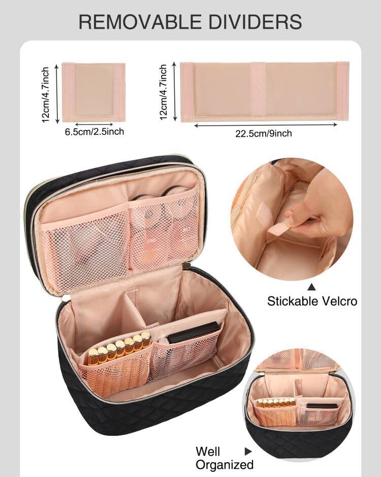 【DIY MAKEUP CASE STORAGE】There are 2 removable velcro dividers in the bottom layer, which meet your needs with DIY Storage, you could decide to display or install the dividers.