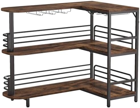 Tribesigns L-Shaped Home Bar Unit, 3 Tier Liquor Bar Table with Storage Shelves and Wine Glasses Holder, Industrial Corner Wine Bar Cabinet Mini Bars for Home Kitchen Pub, Rustic Brown