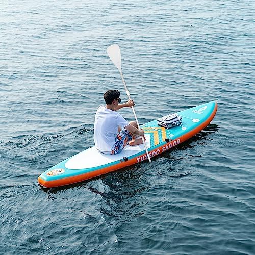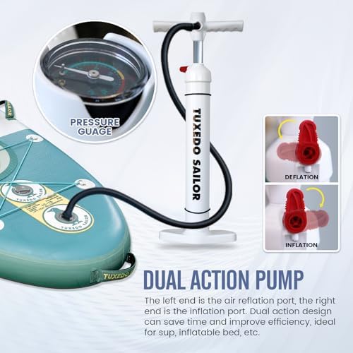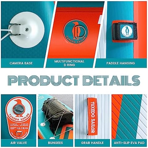 【Excellent Performance】Our inflatable paddleboards are made of high-quality, ultra-lightweight military-grade PVC material, which is 35% lighter than ordinary materials, allowing for smooth forward motion and steering on the water, and easy portability to rivers, lakes, oceans and other scenarios. Tuxedo Sailor paddleboards are durable enough to withstand sunlight and sea water, and are suitable for long hours and long distances, so you can have fun on the water.