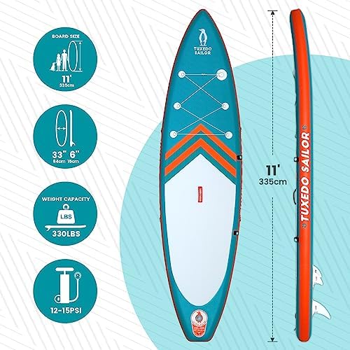 【Extra Large Size】The Tuxedo Sailor paddleboard is 11′ long, 33″ wide and 6″ thick when inflated, making it the larger size paddleboard you are looking for. The extra-large design widens the space for activities, while having strong balance and strong carrying capacity, suitable for multiple people to use, bring children, lovers, pets together!