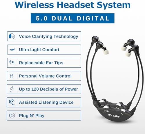TV · EARS 5.0 Dual Digital Wireless Headset System for TV Watching – Includes 2 Headsets & RF Transmitter Compatible with Most TV Brands – Ideal for Seniors & with Hearing Difficulties