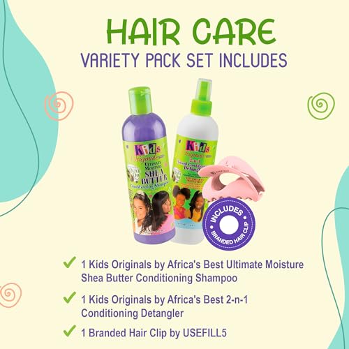 👩 HAIR CARE VARIETY PACK Set Includes 1 Kids Originals by Africa’s Best Ultimate Moisture Shea Butter Conditioning Shampoo | 1 Kids Originals by Africa’s Best 2-n-1 Conditioning Detangler | 1 Branded Hair Clip by USEFILL5