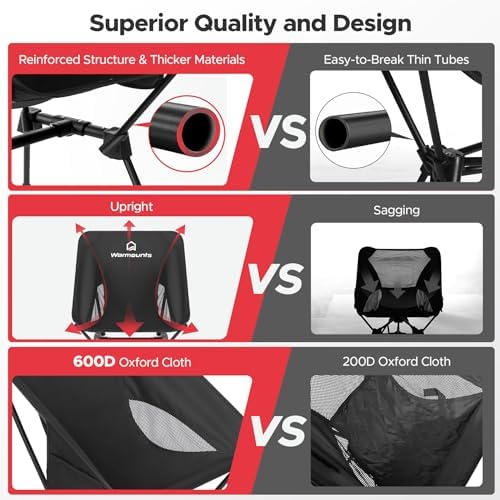 【Reliable & Sturdy Support In Any Setting】WARMOUNTS’ pioneering ultra-stable H-shaped structure. Compared to traditional triangular or square structures of lightweight camping chair, the H-shaped design distributes force evenly, noticeably reducing shaking and making for more stable seating, offering a comfortable experience